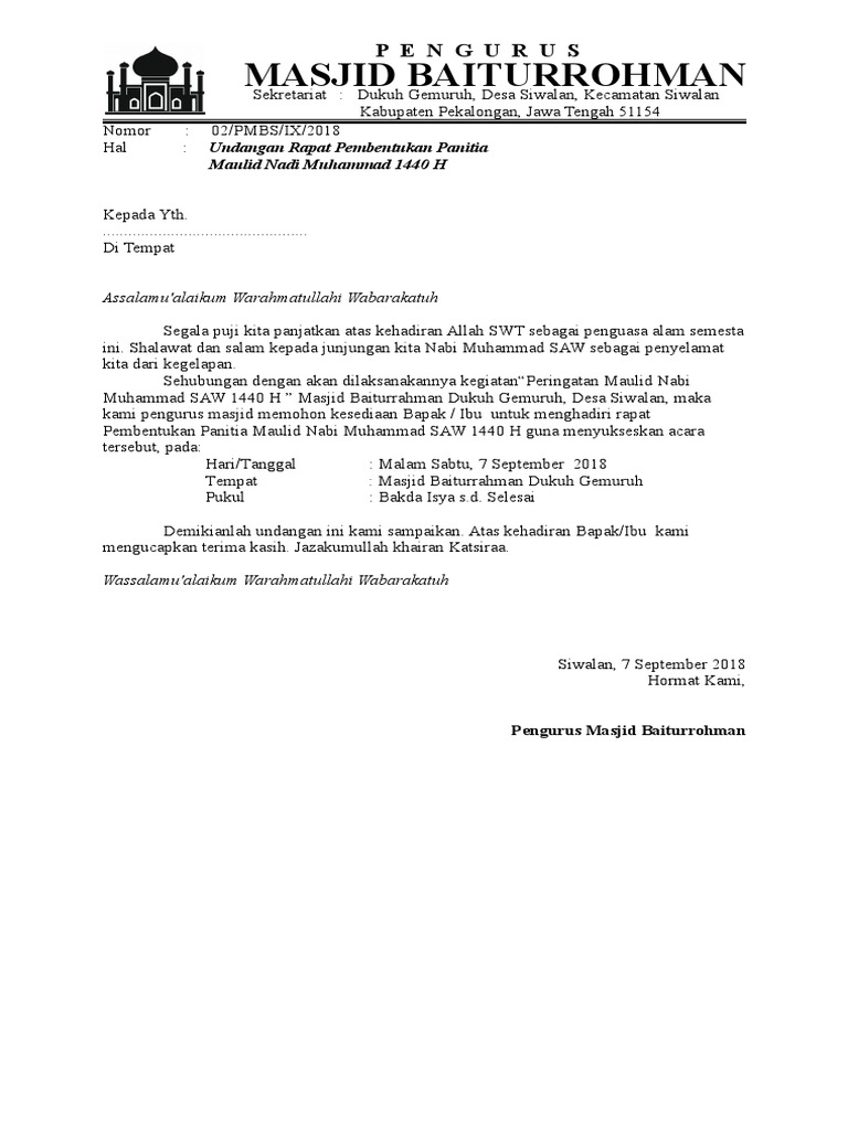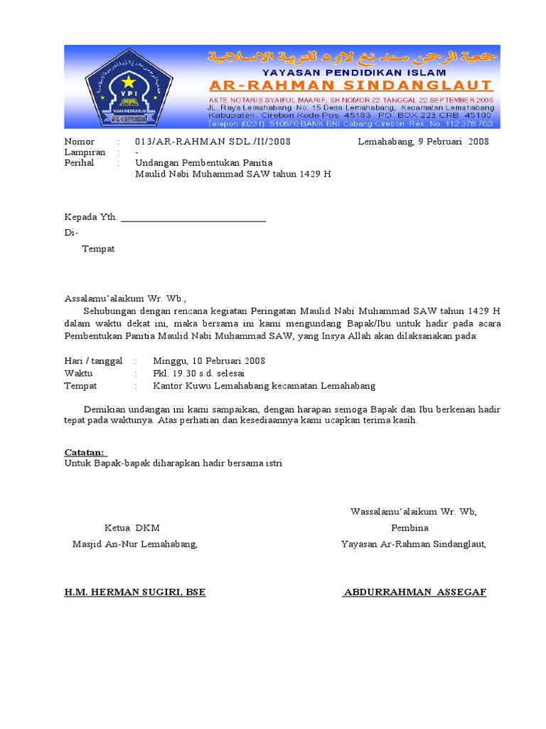 Contoh Surat Undangan Rapat Pembentukan Panitia Maulid ... from imgv2-2-f.scribdassets.com Contoh surat undangan maulid nabi muhammad saw format doc. Berikut adalah contoh surat pengunduran diri (resign) yang baik dan benar dilengkapi dengan format susunan serta file doc yang bisa diedit. Apabila di kemudian hari terdapat kesalahan atau hal lain yang tidak dikehendaki, hal tersebut akan menjadi. Oh iya untuk file pdf undangannya dapat dilihat di bawah ini dan dapat anda download jika. Mengadakan peringatan maulid nabi bagi kaum muslimin sudah menjadi hal yang rutinitas dalam setiap tahunnya. Surat undangan alumni merupakan surat resmi yang dikeluarkan oleh suatu lembaga/instansi yang ditujukan kepada para alumni lembaga terkait dalam rangka meminta kehadiran dalam suatu acara ataupun kegiatan. 0 ratings0% found this document useful (0 votes). 22 full pdf related to this paper.